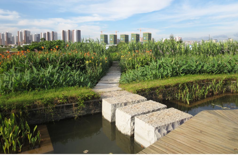 試驗段工程項目體現了“城市綠洲”的設計理念,濕地植物生長良好,水系統循環穩定;其在尺度空間的舒適性、水系打...