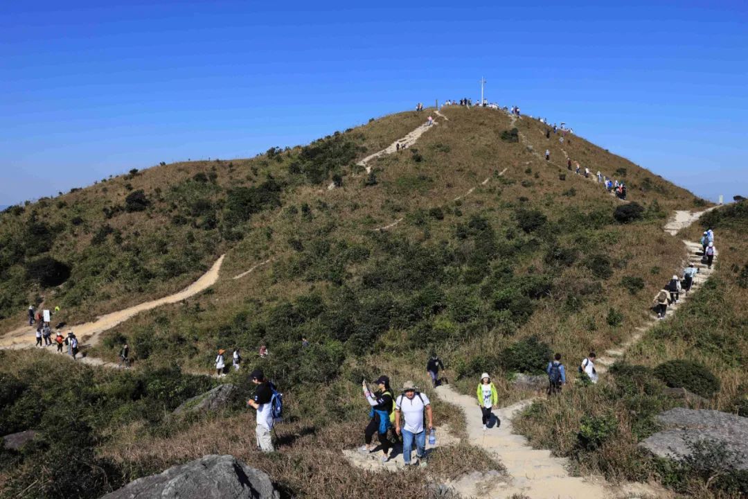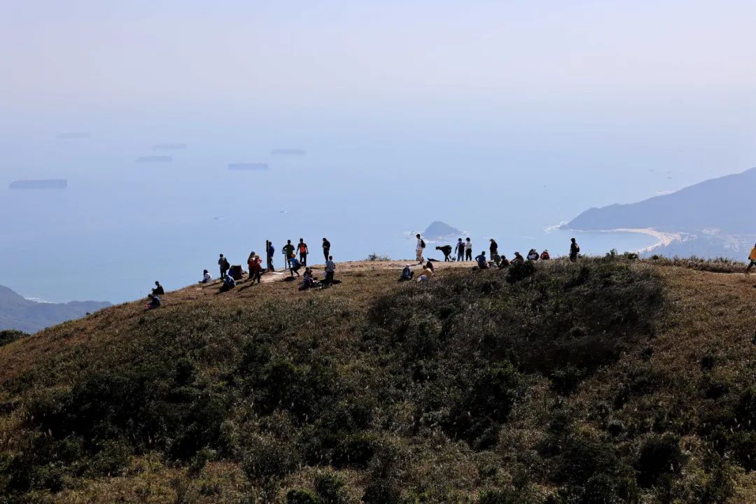 沿途的棧道、觀景平臺、涼亭、活動廣場等景觀節點,充分利用原山石、林木、山澗、海洋等自然環境,成為了極佳的網紅拍照打卡點。頂峰三面環海,草甸遍布,可近觀火山熔巖痕跡,可遠眺大雁頂、排牙山、大鵬灣、楊梅坑、東西涌、三門島、大小甲島等,超五星的270度無敵海景,隨手一拍,每一幀都是手機壁紙。
