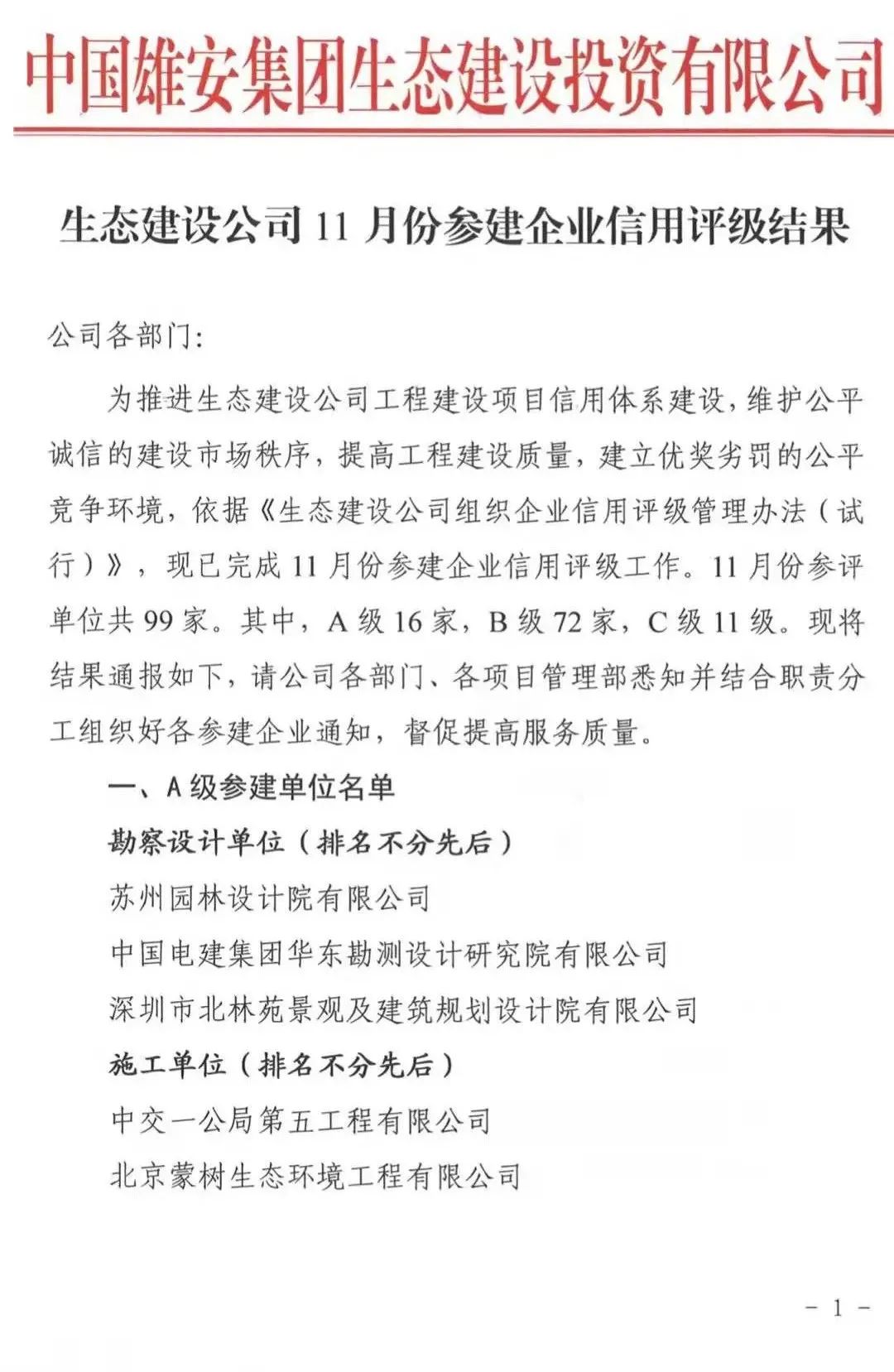 12月18日,中國雄安集團(tuán)生態(tài)建設(shè)投資有限公司公布了11月份對各參建單位在管理、質(zhì)量、信用、安全、文明施工等方面的信用評級結(jié)果,北林苑優(yōu)質(zhì)的設(shè)計質(zhì)量和現(xiàn)場服務(wù)得到了高度認(rèn)可,獲評A級參建單位。