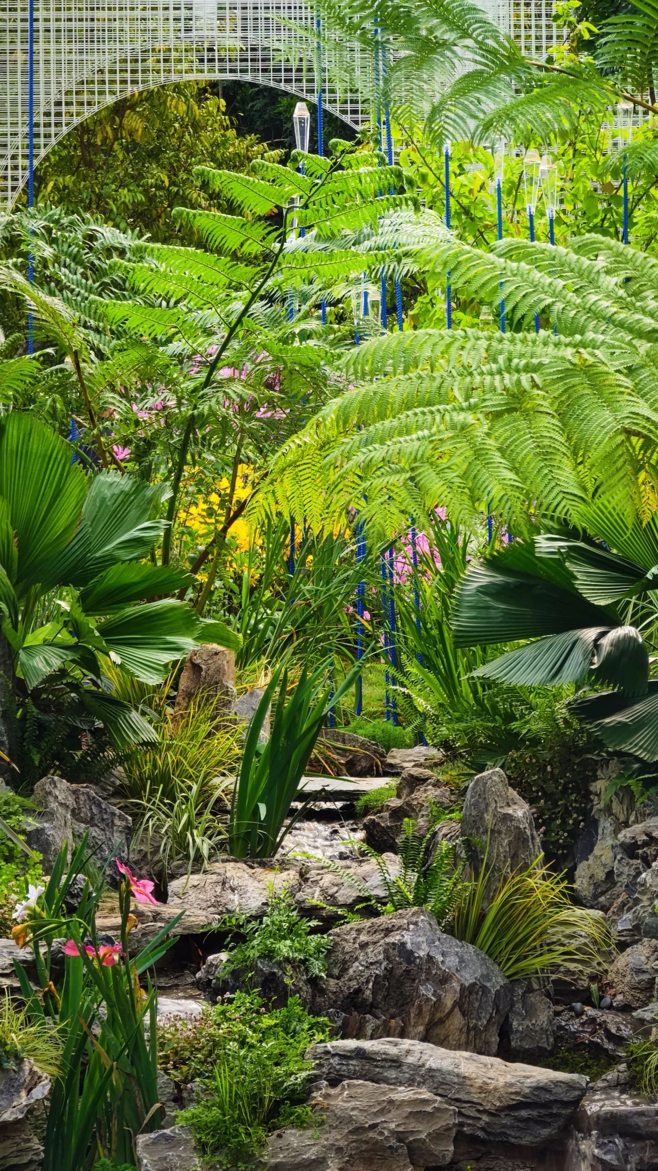 花園共種植了大約130多種植物,我們選用了大量橫琴本地鄉(xiāng)土種,如幌傘楓、石斑木、桫欏、鳳尾蕨、豬籠草、頭花廖等,同時(shí)也選擇了杜鵑、月季、大花飛燕草、百子蓮等植物的新品種進(jìn)行搭配,打造出一種既自然又夢(mèng)幻的氛圍。它們充盈著自然原始的張力,迸發(fā)出一種靈動(dòng)的美感。